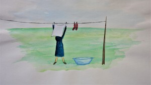 1973De waslijn. Ingekleurde tekening. Thema 'gedeeltelijk zichtbaar'