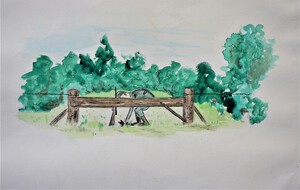 1974Over de schutting. Ingekleurde tekening. Thema 'gedeeltelijk zichtbaar'