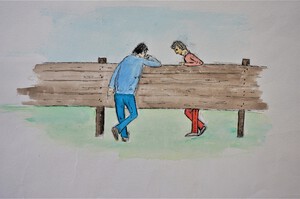 1972Walking the dog. Ingekleurde tekening. Thema 'gedeeltelijk zichtbaar'